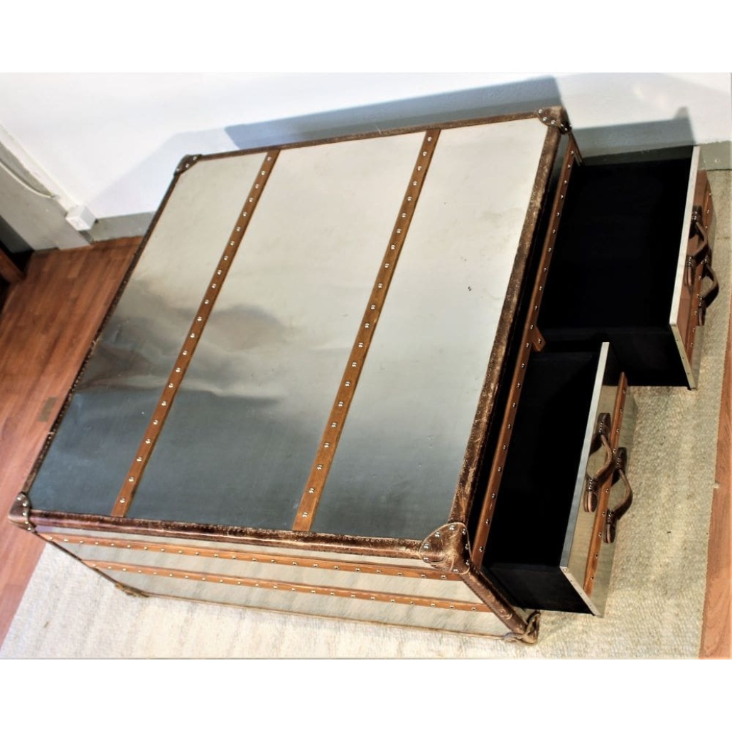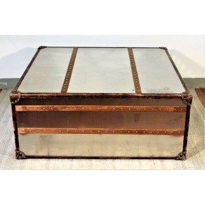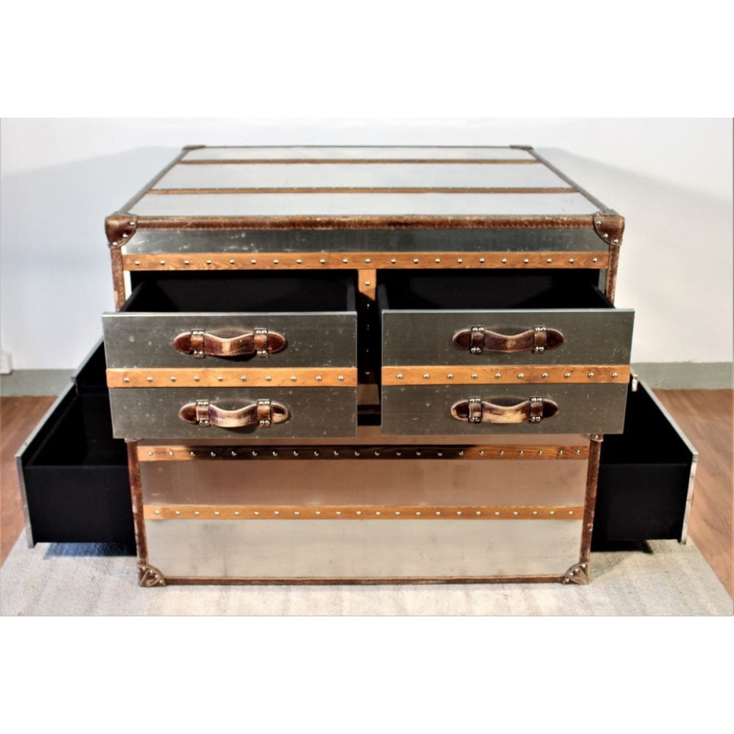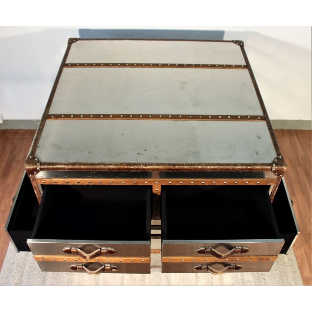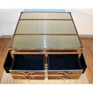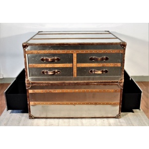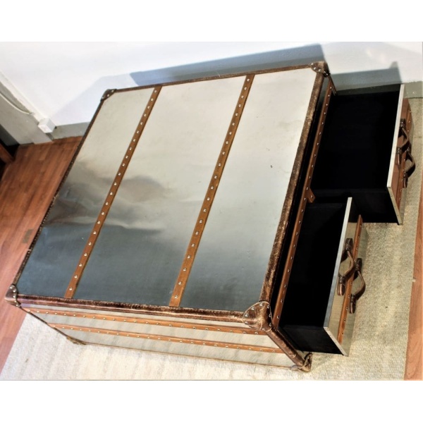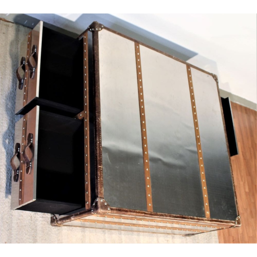 Vintage Cube. Dieses auserlesene Sitz-, Ausstellungsmöbel im kühlen Industrie-Look bietet mit 4 Schubladen ordentlich Stauraum. Es erinnert stark an Reisetruhen aus dem Beginn des vergangenen Jahrhunderts. Moderne Elemente, vermischt mit klassischem Design. Sehr stabil und als Sitzmöbel geeignet. Echt Leder kombiniert mit Aluminium, geschwungene Formen. Ein Spiel zwischen alt und neu.